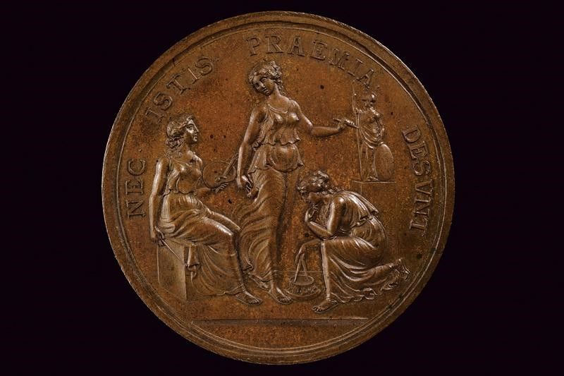 Regno delle Due Sicilie, diametro 5.78 cm. 1818 Emessa nel 1818 per premiare gli artisti. Testa coronata a destra. Iscrizione 'FERDINANDVS I. D. G. REGNI SICILIARVM ET HIERVSALEM REX P. F. A'. Sul retro le figure allegoriche delle tre Arti ed iscrizione 'NEC • ISTIS • PRAEMIA • DESVNT'.