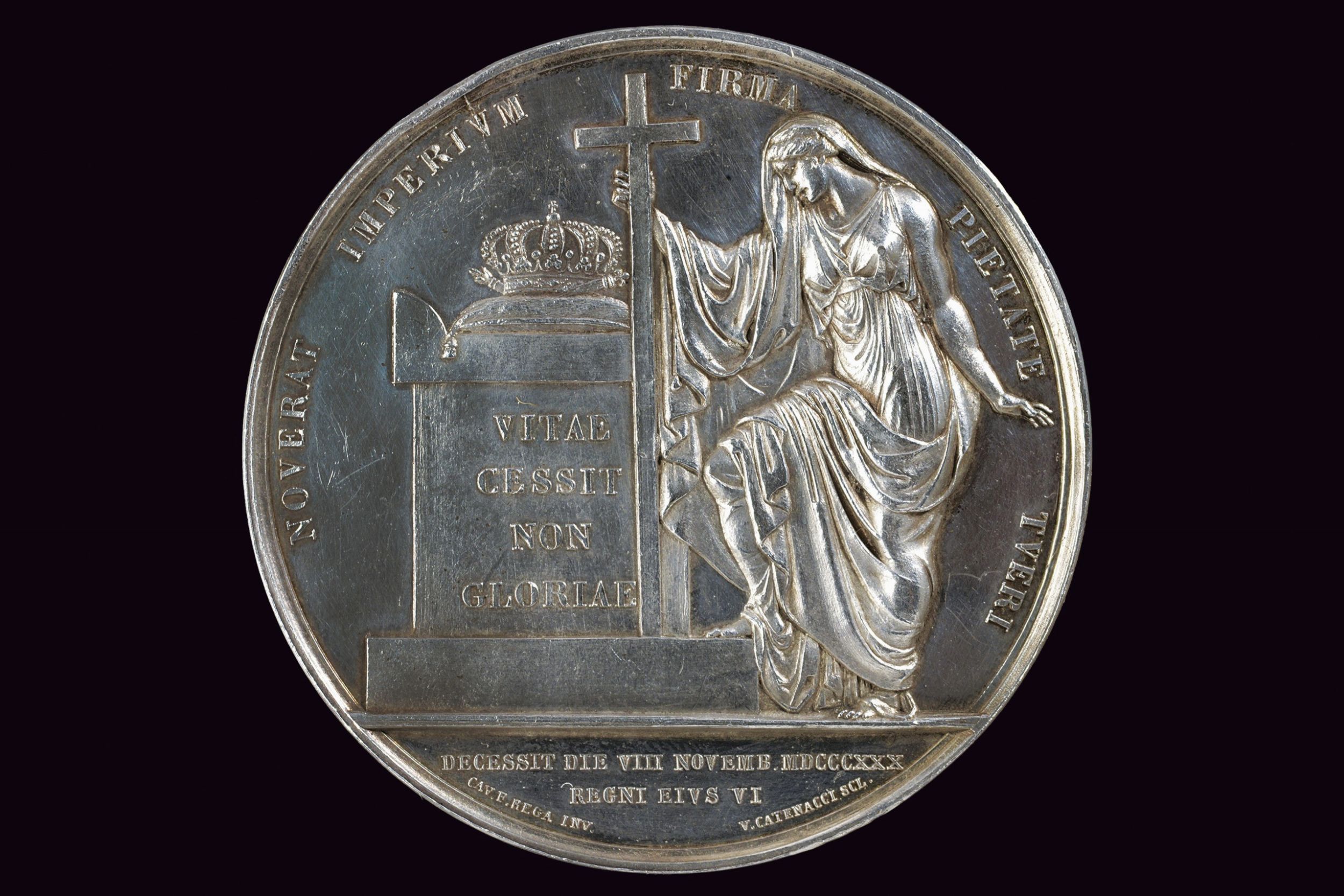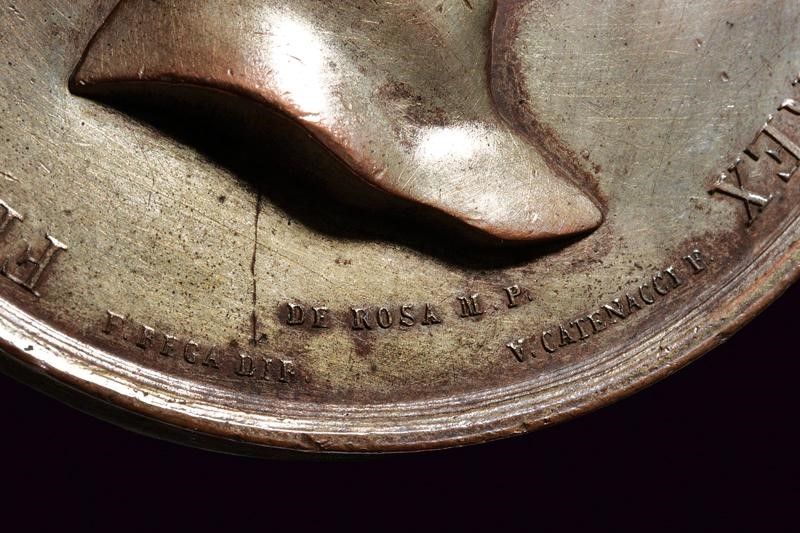 Napoli, diametro 6.3 cm. 1830 Per L'ascensione al trono, 1830. Sul recto busto in altorilievo a destra con iscrizione ' FERDINANDVS II . REGNI VTRIVSQVE SICILIAE ET HIERVS REX'. Marcato 'De Rosa'. Opus Vincenzo Catenacci e M. Laudicina. Sul retro 'PIETATE AC IVSTITIA COMITE INIVIT IMP