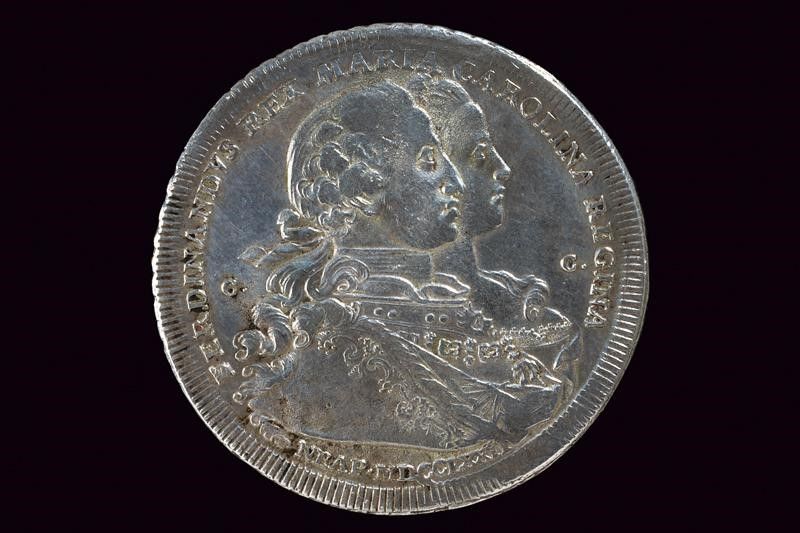 Napoli, diametro 4.09 cm. 1772 Sul recto busti accollati a destra con iscrizione 'FERDINANDVS REX MARIA CAROLINA REGINA'. Marcature 'CC', 'BP' e 'R', sotto 'NEAP MDCCLXXII'. Sul retro figura femminile seduta verso sinistra con fanciullo in grembo, in fondo il Vesuvio. Iscrizione 'FECUN