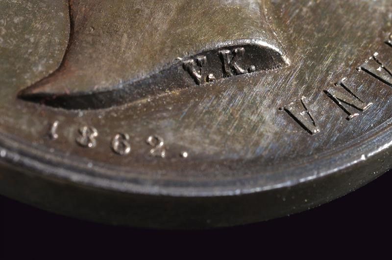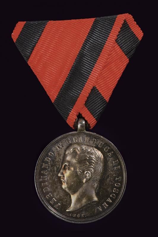 1862 In argento. Al recto busto di Ferdinando a sinistra, con iscrizione 'FERDINANDO IV GRANDUCA DI TOSCANA', Opus. VK; in basso 1862. Al verso 'AL MERITO'. Con nastro triangolare. Molto rara.