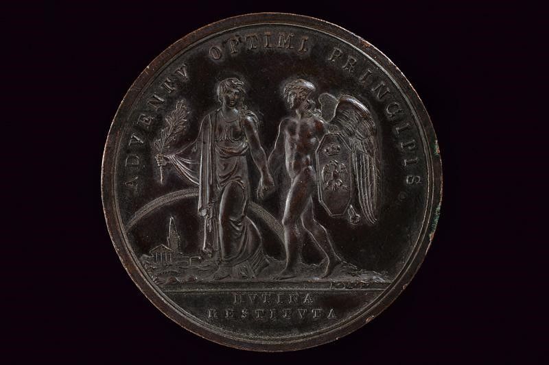 Modena, diametro 4.16 cm. 1814 Per il ritorno di Francesco IIII a Modena nel 1814. Opus Manfredini Bramsen. Al recto testa a sinistra con iscrizione 'FRANCISCO IIII A. A. PR II ET B DVCI. MVT. REG. MIR. MDCCCXIIII'. Al verso allegoria ed iscrizione 'ADVENTV OPTIMI PRINCIPIS'. Nell'ese