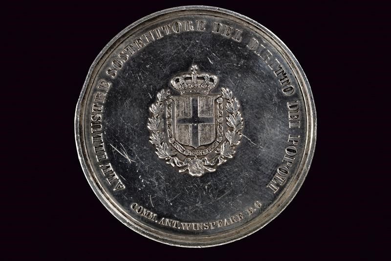 Napoli, diametro 5.28 cm. 1862 Sul recto stemma Savoia coronato entro collare della SS. Annunziata tra fronde di alloro e sotto corona. Iscrizione 'ALL'ILLUSTRE SOSTENITORE DEL DIRITTO DEI POPOLI'. Nell'esergo: 'COMM. ANT. WINSPEARE D.G'. Sul retro iscrizione 'S. A. I. / GIROLAMO NAPOL