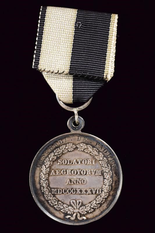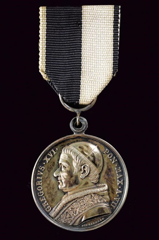 Stato Pontificio, diametro 3.7 cm. 1837 Al recto busto a sinistra con iscrizione 'GREGORIVS XVI PON MAX A VII', Opus Ric. Cerbara; al verso 'SOLATORI AEGROTORVM ANNO MDCCCXXXVII' e sul bordo il nome 'PASCHALI DE PAOLIS'. Con nastro.