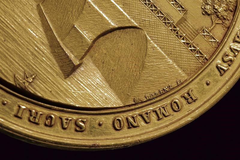 Stato Pontificio, diametro 76.5 cm. 1835 In argento dorato. Sul recto veduta dell'imbocco dei due nuovi cunicoli dell'Aniene di Monte Catillo con iscrizione 'GREGORIVS XVI AVSV ROMANO SACRI PRINCIPATVS ANNO II INCHOAVIT V PERFECIT' Rv. Uscita dell'acqua dai due cunicoli, oltre la Grotta delle si