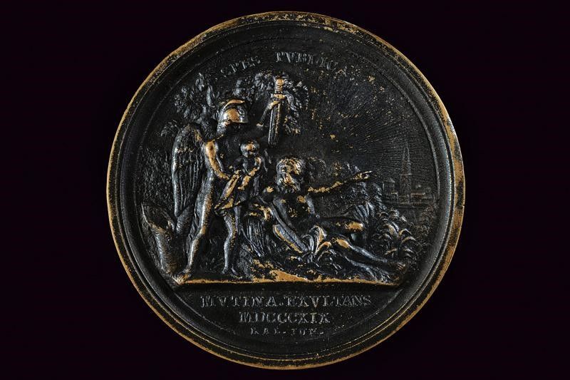 Modena, diametro 8.1 cm. 1819 Al recto teste accollate a destra di Francesco IV e della moglie Maria Beatrice di Savoia, con iscrizione 'FRANCISCO. IV. ATESTIO. ET.MARIAE. BEATRICI. CONJVGO. OO. PP.' Al verso figura allegorica seduta rappresentante il fiume Panaro, il quale, con la de