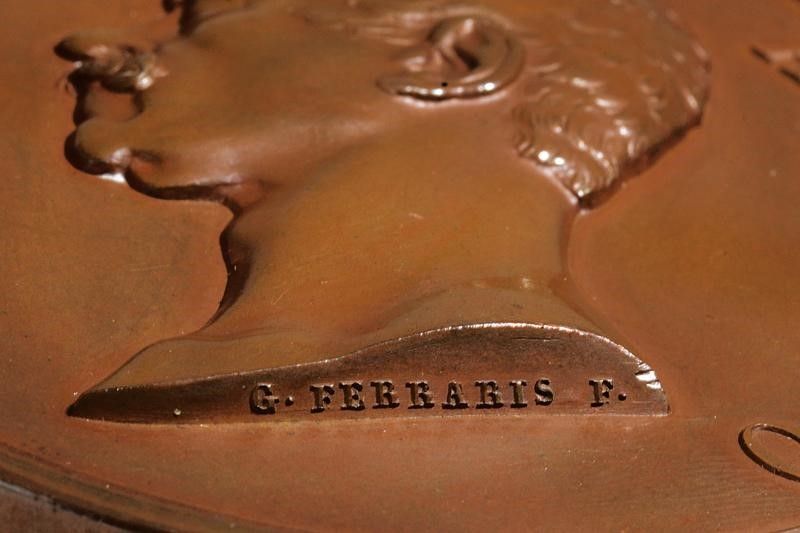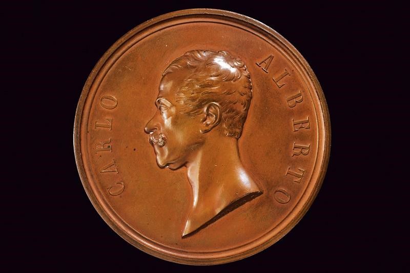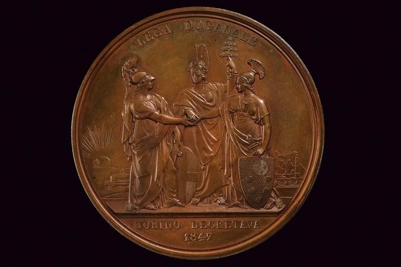 Regno di Sardegna, diametro 7 cm. 1847 In bronzo. Al dritto busto del re verso sinistra, al bordo 'CARLO ALBERO'; opus 'G. FERRARIS F.' Al rovescio nel campo tre figure allegoriche, il Piemonte, lo Stato Pontificio, la Toscana si stringono la mano destra, nello sfondo a sinistra il sole nascen