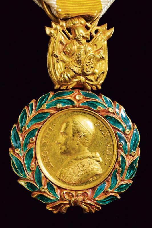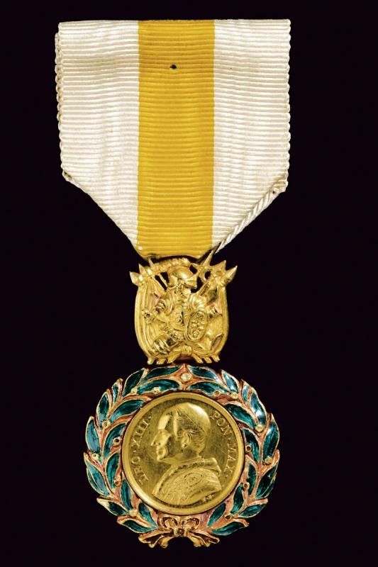 1870 circa Al recto busto a sinistra con scritta 'LEO XIII PON. MAX.'. Opus 'F.B.' entro corona d'allori smaltati, con trofeo militare. Al verso dicitura 'BENE / MERENTI' posta fra due fiori. 13.5 gr.