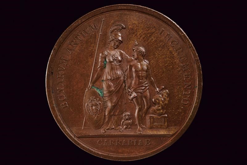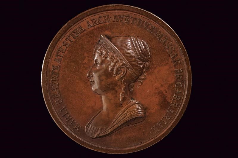 Modena, diametro 5.8 cm. 1814 Busto con diadema a sinistra, con iscrizione 'MARIA BEATRIX ATESTINA ARCH AVST DUX MASSAE PR. CARRARIAE'. Opus: Giuseppe Lang. Sul retro 'BONARVM ARTIVM INCREMENTO CARRARIAE'. Al centro Minerva in piedi con lancia e scudo poggia la mano sulla spalla del g