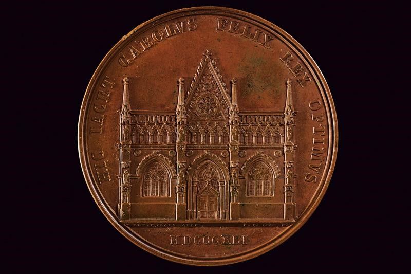 Regno delle Due Sicilie, diametro 5.5 cm. 1841 In bronzo, medaglia Sepolcro di Carlo Felice ad Altacomba. Al dritto busto diademato e velato con sguardo a sinistra di Maria Cristina Borbone, al bordo 'M. CHRISTINA BORBONIA AVG. TEMPLVM ALTAECVMBAE PERFECIT'; opus 'G. GALEAZZI F.' Al rovescio prospetto
