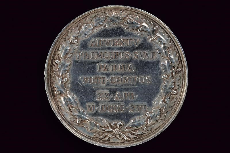 Ducato di Parma e Piacenza, diametro 4.1 cm. 1816 Al recto busto a destra con iscrizione 'LVDOV ARCH AVSTR D G PARM PLAC ET VAST DVX'. Opus: G. A. Santarelli. Al verso 'ADVENTV / PRINCIPIS SVAE / PARMA / VOTI / COMPOS / XX COMPOS / XX APR / M DCCC XVI' in corona di fronde di quercia.