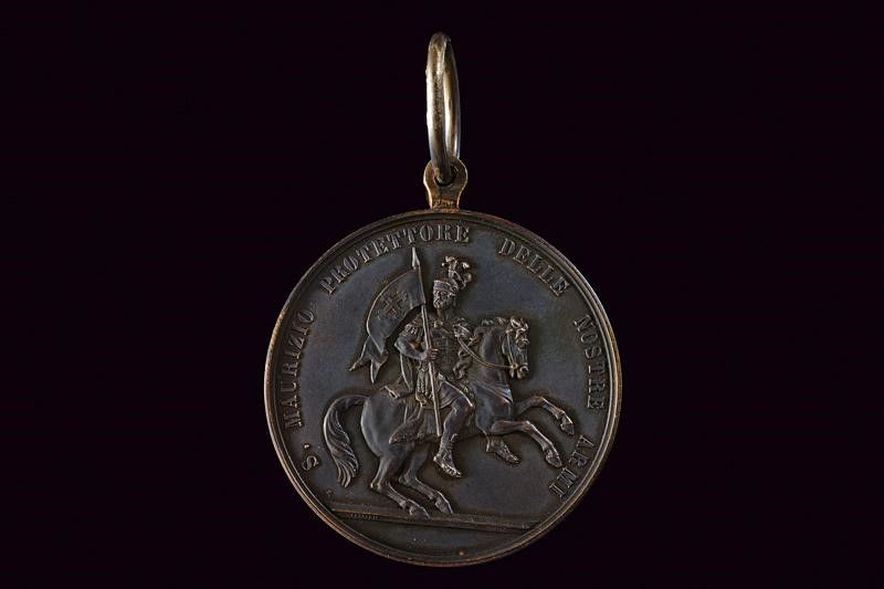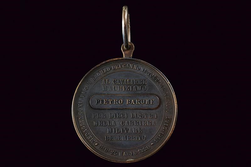 Regno d'Italia, diametro 5.17 cm. Prima metà del XX Secolo In bronzo. Sul recto S. Maurizio su cavallo con iscrizione 'S. MAURIZIO PROTETTORE DELLE NOSTRIE ARMI'. Opus: Ferraris. Sul retroIscrizione al centro 'AL CAVALIERE MAURIZIANO PIETRO BARONE (in rilievo) PER DIECI LUSTRI NELLA CARRIERA MILITARE MENEMERITO'.