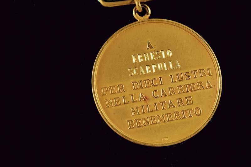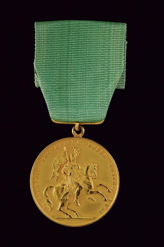 Repubblica Italiana, diametro 3.59 cm. Seconda metà del XX Secolo In oro. Al recto San Maurizio a cavallo, con iscrizione 'S. MAURIZIO PROTETTORE DELLE NOSTRIE ARMI'. Opus: Ferraris. AL verso 'A PIETRO FORESI PER DIECI LVSTRI NELLA CARRIERA MILITARE BENEMERITO'. Punzone 'Z 917'. Con nastro verde. Oro 917/1000. 35 g. Rar