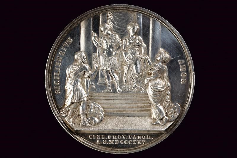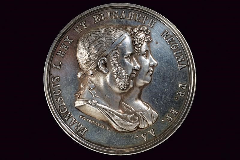 Regno delle Due Sicilie, diametro 5.3 cm. 1825 In argento. Al dritto busti affiancati del Re con il capo cinto dalla tenia e della Regina in abito regale, al bordo 'FRANCISCUS I. REX ET ELISABETH REGINA PP. FF. AA.'; opus 'FF. COSTANZA F.'. Al rovescio i sovrani stanti sul pronao d'un tempio intenti a