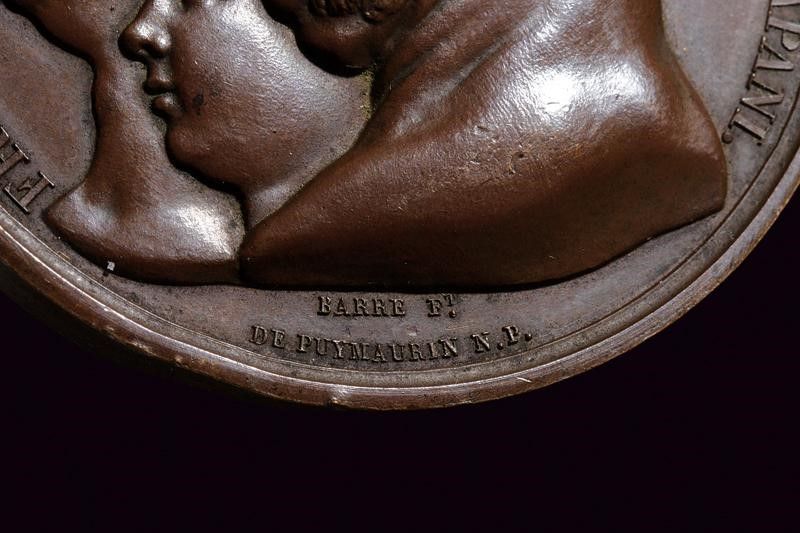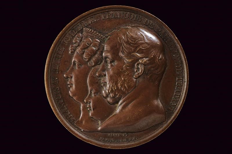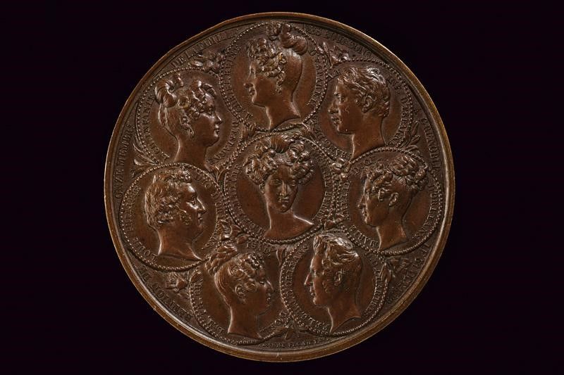 Regno delle Due Sicilie, diametro 5.1 cm. 1829 In bronzo. Al dritto busti affiancati dei reali di Napoli con sguardo verso sinistra, al bordo iscrizione ' FRANCOIS 1.er MARIE ISABELLE. FRANCOIS DE PAULE C.te DE TRAPANI.'; opus 'BARRE F. / DE PUYMAURIN N. P.' Al rovescio busti degli otto membri della f
