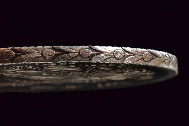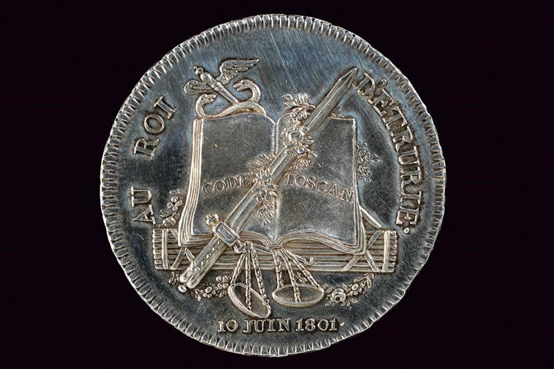 Francia, diametro cm. 1801 In argento. Al dritto spada, bilancia, caduceo e fascio su libro aperto, questo con scritte 'CODE / TOSCAN.'; al bordo 'AU ROI D'ETRURIE', sotto '10 JUIN 1801'. Al rovescio genio alato della Francia stante a destra regge con mano la mano una rosa; al bord