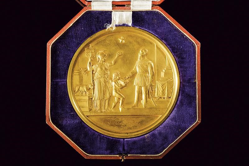 Regno d'Italia, diametro 10.8 cm. 1870 In bronzo dorato. Al dritto il Re in piedi in uniforme militare, volto a sinistra, riceve da un genio alato l'urna contenente i voti del plebiscito; a sinistra la figura allegorica della città di Roma corazzata ed elmata, saluta il re, regge asta 'S.P.Q.R