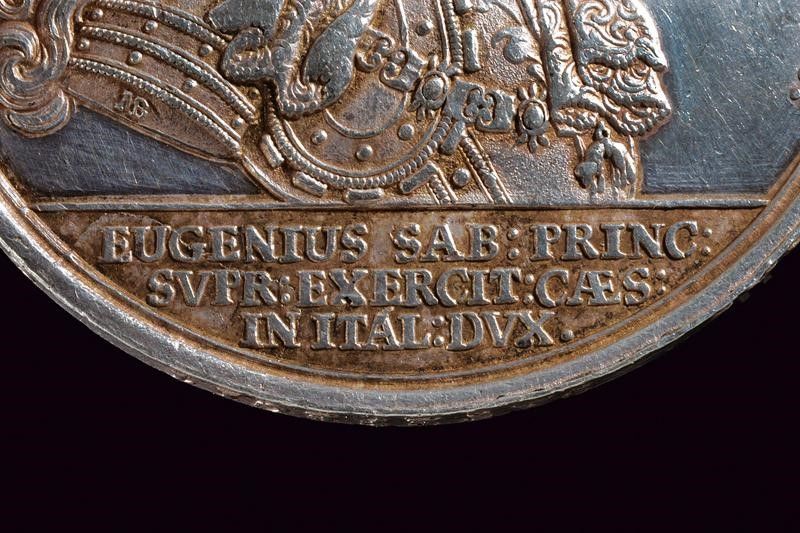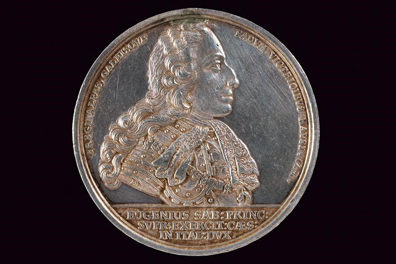 Regno di Sardegna, diametro 4.3 cm. 1701 In bronzo argentato. Al dritto busto corazzato a destra con parrucca e sciarpa, al bordo 'FREGI ALPES, GALEISQVE / PADVM VICTRICIBVS HAVSI. CLAUD'; in esergo ' EVGENIVS SAB: PRINC: SVPR: EXERCIT: CÆS: IN ITAL: DVX.' Al rovescio vista del fiume e della bat