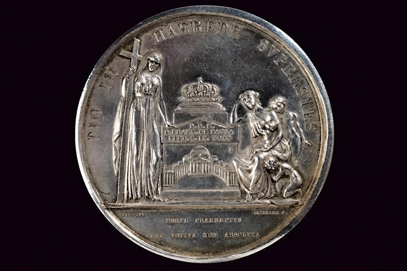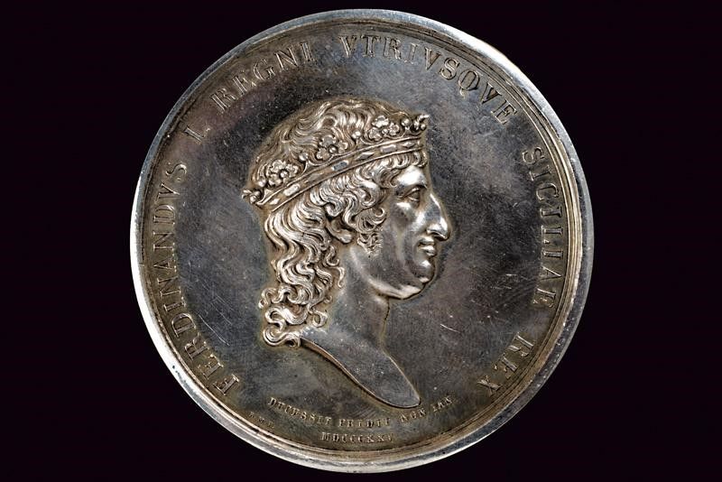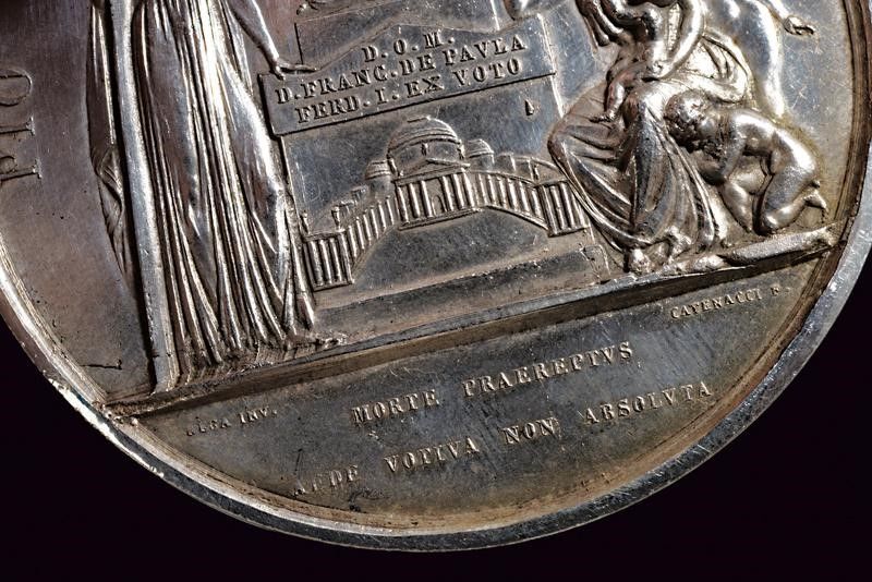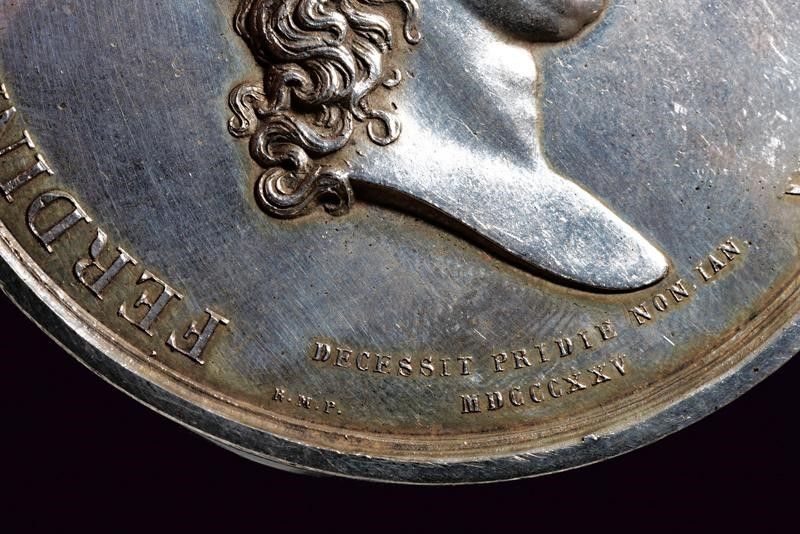 Regno delle Due Sicilie, diametro 5 cm. 1830 In argento. Al dritto busto del re con sguardo verso destra, al bordo 'FRANCISCVS I. REGNI VTR. SICIL. ET HIER REX'; opus 'F. REGA D. / V. CATENACCI F.'. Al rovescio la Religione stante presso il sarcofago Reale, sopra al quale c'è un cuscino con sopra la