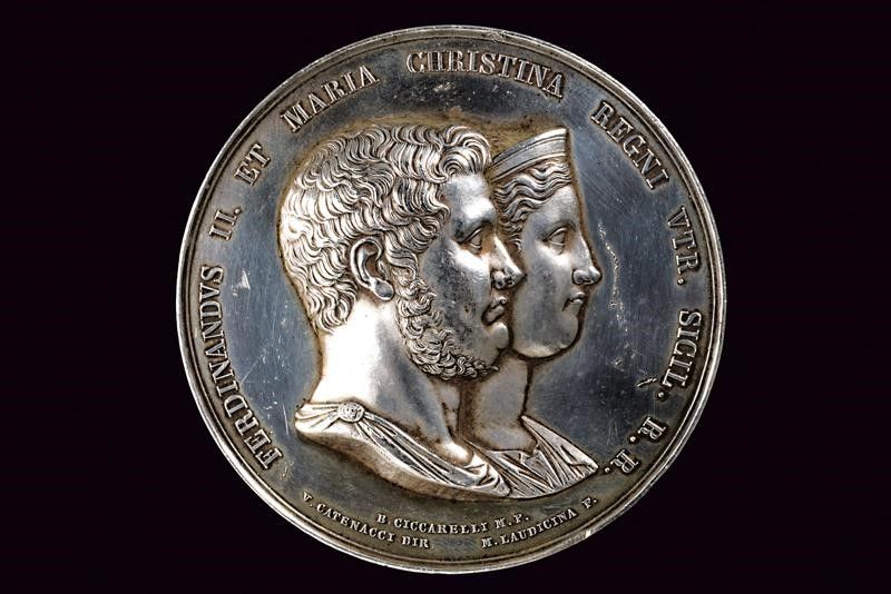 Regno delle Due Sicilie, diametro 6.5 cm. 1836 In argento. Al dritto busti affiancati a destra del Re e della Regina Maria Cristina, al bordo 'FERDINANDVS II. ET MARIA CHRISTINA REGNI VTR. SICIL. R. R.', opus 'B.CICCARELLI M.P. / V. CATENACCI DIR. / M. LAUDICINA F.'. Al rovescio allegoria della CittÃ