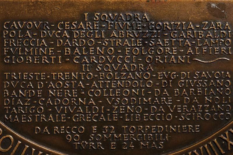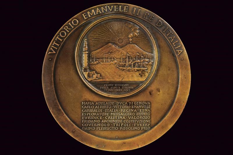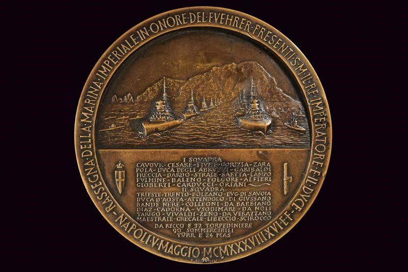 Regno d'Italia, diametro 11 cm. 1938 In bronzo. Al dritto scena della rassegna navale svoltasi davanti all' isola di Capri, al bordo 'RASSEGNA DELLA MARINA IMPERIALE IN ONORE DEL FVEHRER PRESENTI S M IL RE IMPERATORE E IL DVCE / NAPOLI V MAGGIO MCMXXXVIII XVI E F'; in esergo tra stemma di ca