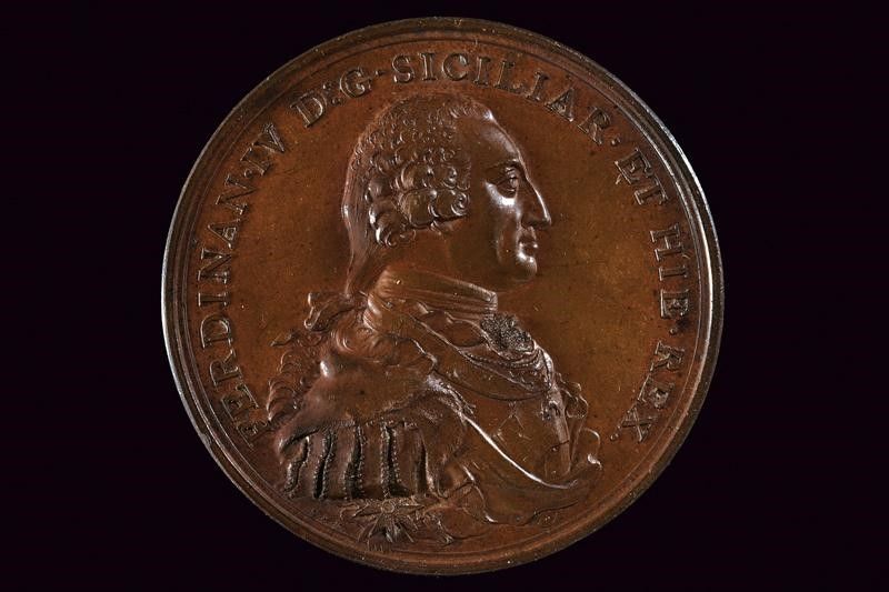 Regno di Napoli, diametro 4.7 cm. 1799 In bronzo. Al dritto busto corazzato verso destra con il collare del Toson d'oro, al bordo 'FERDINAN IV D:G SICILIAR ET HIE REX'; sotto 'C.H.K'. Al rovescio veduta di Napoli con Castel S.Elmo, nella rada vascello inglese, in primo piano due gruppi di pers