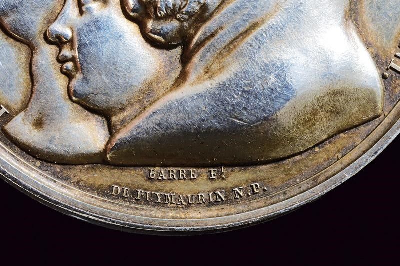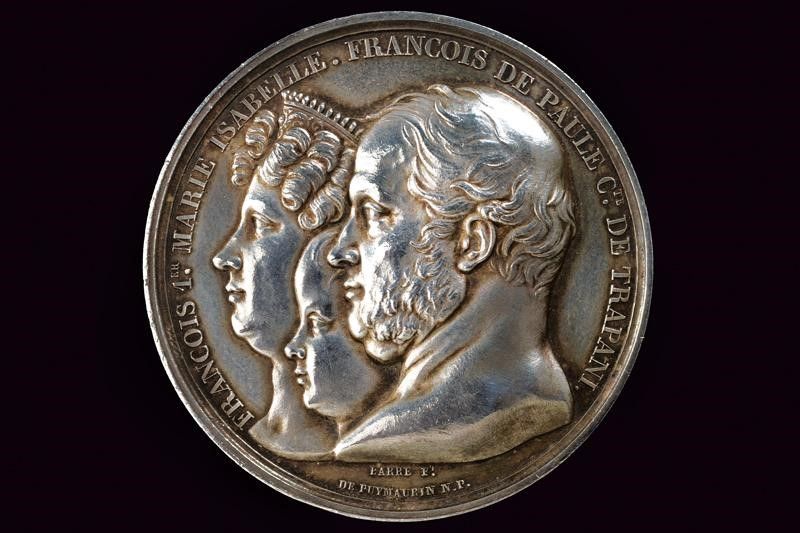 Parigi, diametro 5 cm. 1830 In argento. Al dritto busti affiancati dei reali di Napoli con sguardo verso sinistra, al bordo iscrizione ' FRANCOIS 1.er MARIE ISABELLE. FRANCOIS DE PAULE C.te DE TRAPANI.'; opus 'BARRE F. / DE PUYMAURIN N. P.' Al rovescio stemma coronato dei Borbone en
