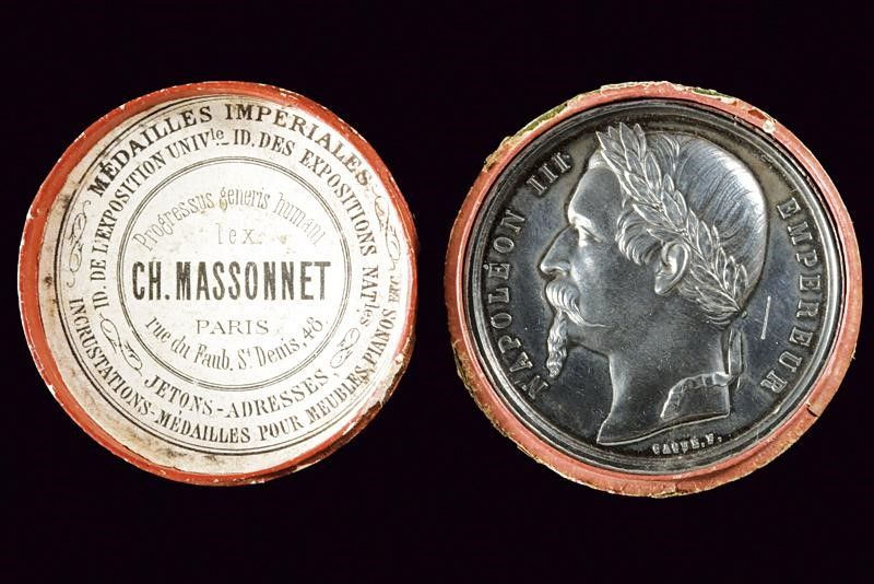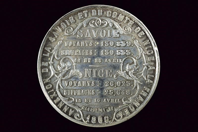 Francia, diametro 5 cm. 1860 In argento. Al dritto busto verso sinistra, al bordo 'NAPOLEON III EMPEREUR'; sotto il taglio del collo opus 'CAQUE F.'. Al rovescio 'ANNEXION DE LA SAVOIE ET DU COMTE DE NICE A LA FRANCE 1860, date e dati relativi ai voti. 59 g. In astuccio originale mar