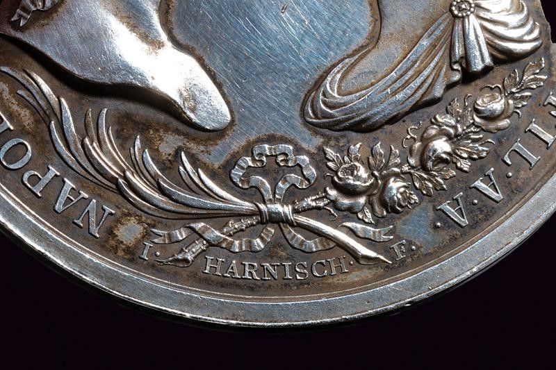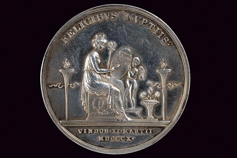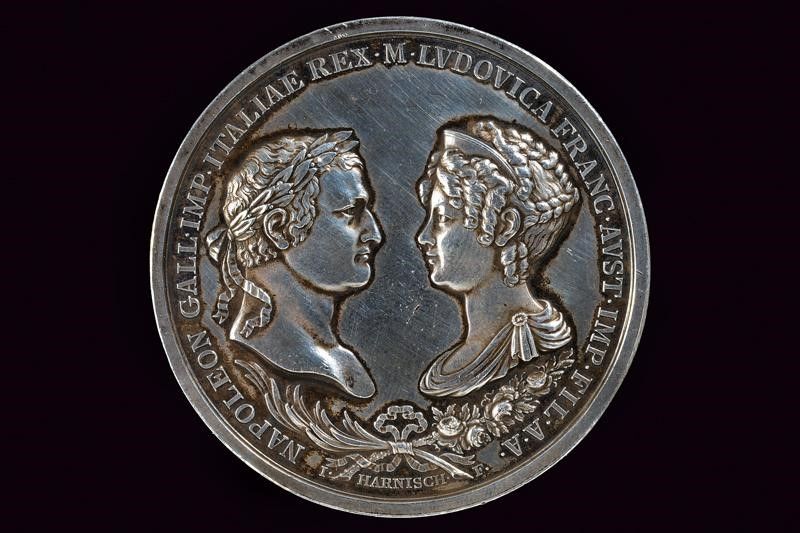 Francia, diametro 4.8 cm. 1810 In argento. Al dritto teste contrapposte, sotto due rami intrecciati di palma e di rosa, al bordo “NAPOLEON GALL. IMP. ITALIAE REX. M. LUDOVICA FRANC. AUST. IMP. FIL. A. A.”; opus 'HARNISCH'. Al rovescio la città di Vienna, turrita e seduta, tiene con la