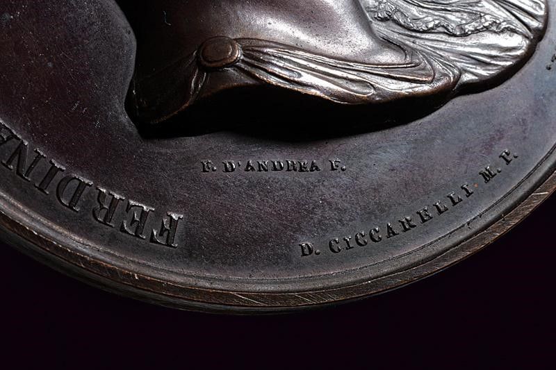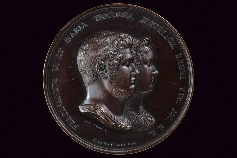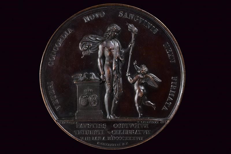 Regno delle Due Sicilie, diametro 6.8 cm. 1837 In bronzo. Al dritto busti affiancati verso destro, al bordo 'FERDINANDVS II ET MARIA THERESIA AVSTRIACA REGNI VTR. SIC. R. R.'; sotto 'F. D'ANDREA F. / D. CICCARELLI M. P'. Al rovescio Imene riceve una fiaccola da un genio alato, dietro, due colombe su c