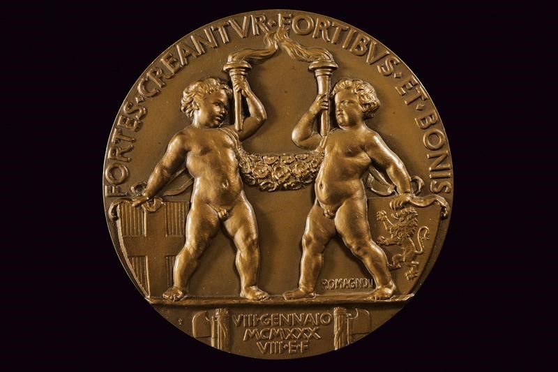 Regno d'Italia, diametro 8 cm. 1930 circa In bronzo. Al dritto busti accollati di Umberto II, con divisa, decorazioni e collare della SS. Annunziata, e di Maria Josè, con diadema e stola di pelliccia, intorno 'VMBERTO DI SAVOIA E MARIA JOSE' DEL BELGIO' al bordo. Al rovescio due putti stanti e af