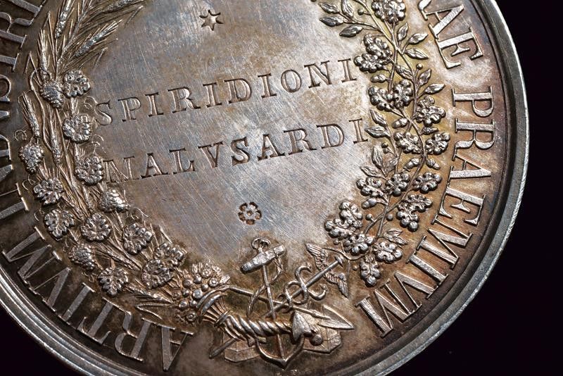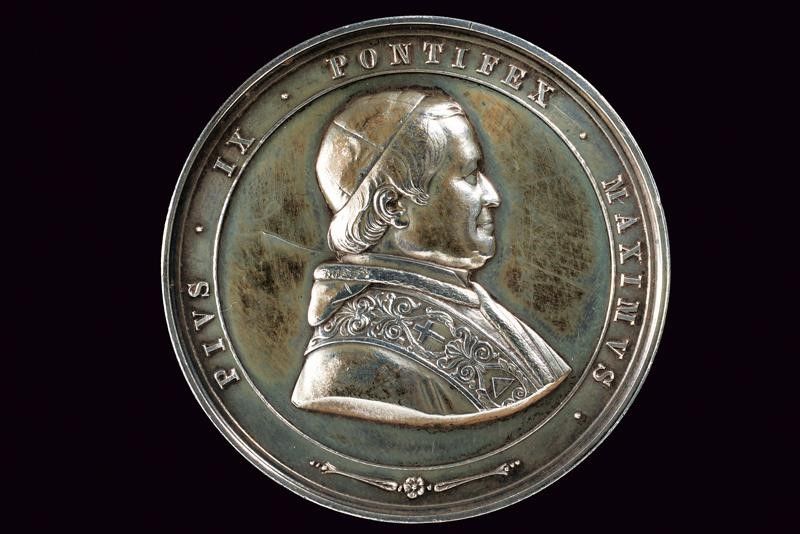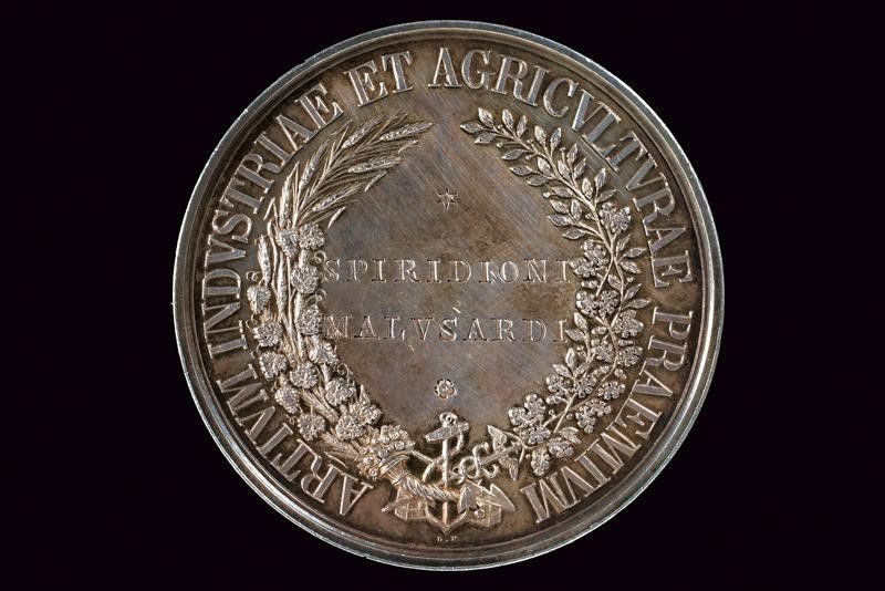 1846 - 1878 Al recto busto con volto verso destra 'PIVS IX PONTIFEX MAXIMVS', al verso 'ARTIVM INDUSTRIAE ET AGRICVLTVRAE' con nominativo 'SPIRIDIONI MALVSARDI'. Argento. 59 gr.
