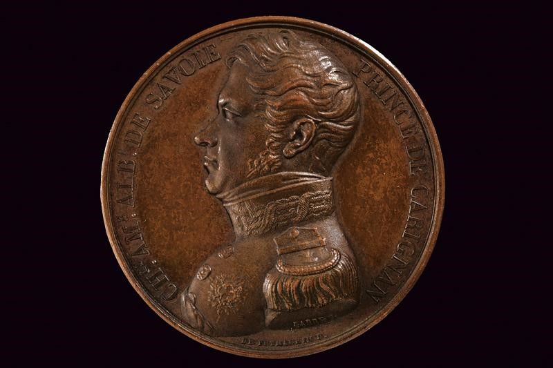 Francia, diametro 4 cm. 1823 Al dritto busto a sinistra in uniforme, al bordo 'CH. AM. ALB. DE SAVOIE PRINCE DE CARIGNAN'; sul taglio spalla 'BARRE F.', opus 'DE PUYMAURIN D.'. Al rovescio 'PRISE DU TROCADERO LE 31 AOUT 1823.' e sotto corona di alloro la dedica 'LES REGIMENTS DE LA G