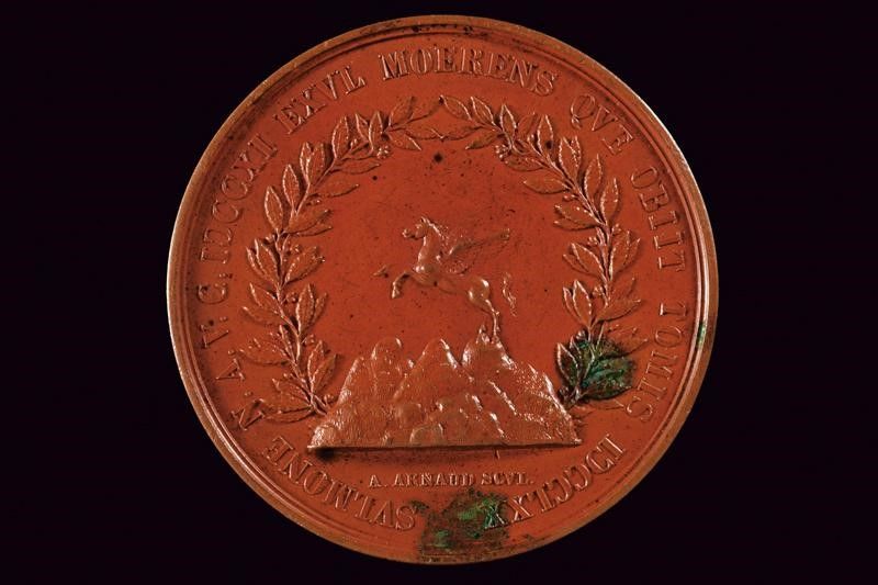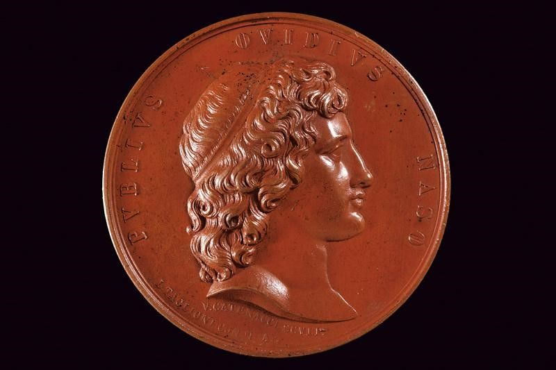 Regno delle Due Sicilie, diametro 4 cm. 1830 In bronzo. Al dritto, busto verso destra, al bordo 'PVBLIVS OVIDIVS NASO'; opus 'V. CATENACCI SCVL. P. / L. TAGLIONI CON NEAP.'. Sul retro entro rami di quercia un paesaggio montuoso sorvolato da Pegaso; al bordo 'SVLMONE N.A.V.C. (M)CCXI EXVL MOERENS QVE