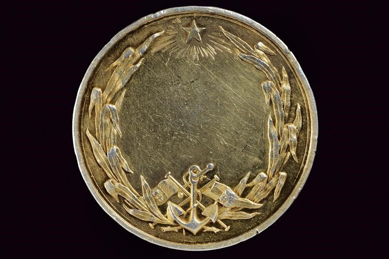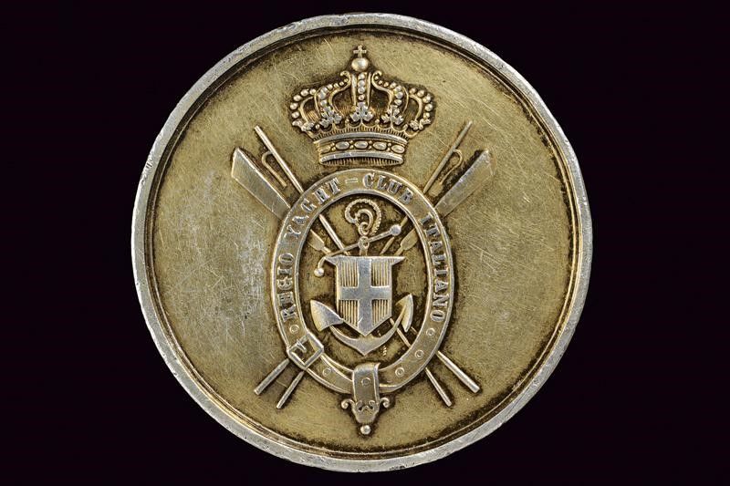 Regno d'Italia, diametro 5.3 cm. Fine XIX inizio XX Secolo In argento. Al dritto logo del Regio Yacht Club Italiano. Al rovescio rami di palma, fermati in basso da ancora su bandiere decussate e sormontati da stella raggiante, campo vuoto per dedica. 69 g.