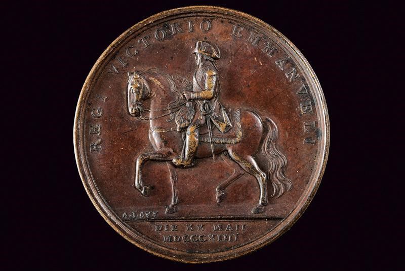 1814 In bronzo. Al dritto il re a cavallo, al bordo 'REGI VICTORIO EMMANVEL I'; in esergo 'DIE XX MAII MDCCCXIIII'. Al rovescio nel campo 'COHORS EQUITATA SINGULARIUM REGIS NOBILIUM VOLUNTARIORUM'.