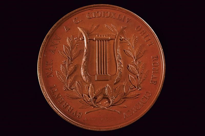 Regno delle Due Sicilie, diametro 4 cm. 1830 In bronzo. Al dritto busto verso sinistra; al bordo 'TORQVATVS TASSO ITALICORVM EPICORVM PRINCEPS'; opus'TAGLIONI / CATENACCI'. Al rovescio lira tra rami di quercia; al bordo 'SVRRENTI NAT. ANN. A. C. (MD) XLIV OBIT ROMAE (MD) XCV'.