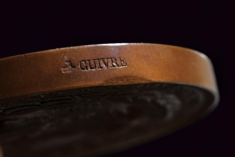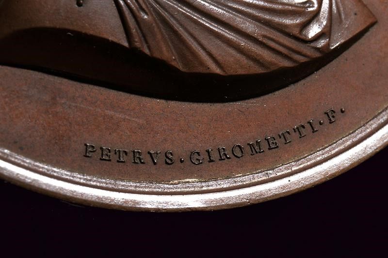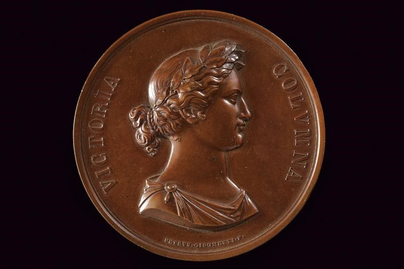Roma, diametro 6 cm. 1840 In bronzo, di forma circolare; al dritto busto laureato con iscrizione 'VICTORIA COLVMNA', opus 'PETRVS GIROMETTI F'; al rovescio entro corona di alloro l'Araba Fenice risorgente dalle fiamme e irradiata dal sole; ai lati stemmi Torlonia e Colonna, al bor