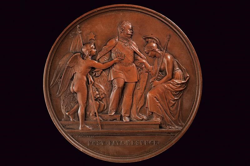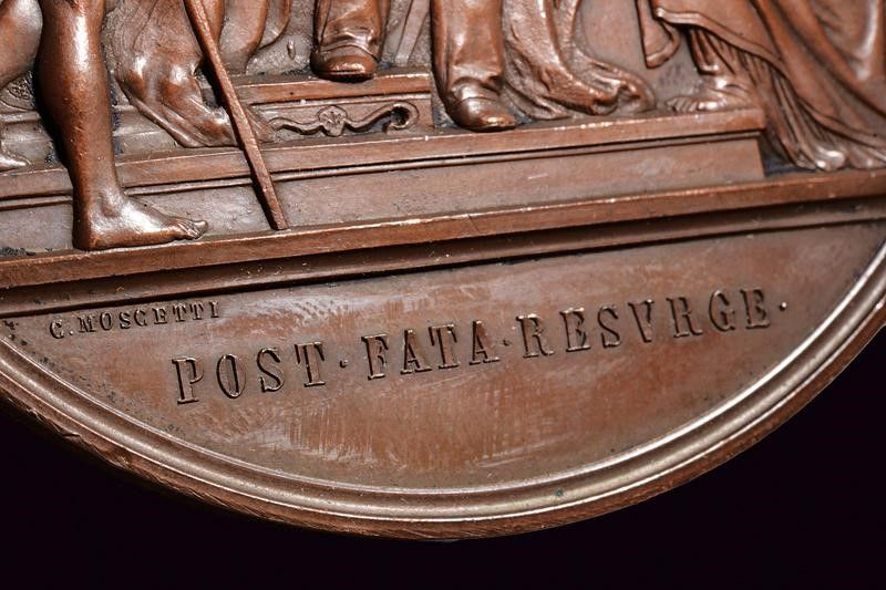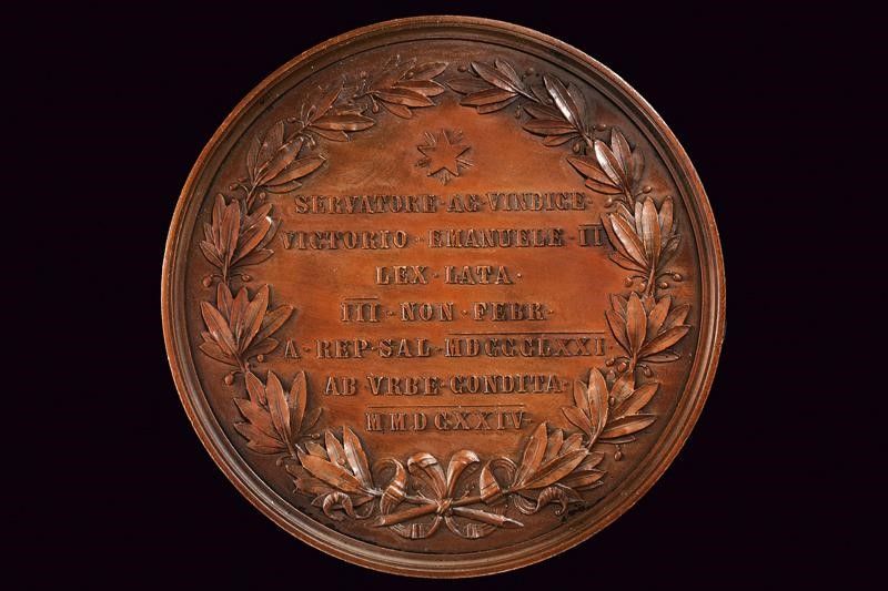 Regno d'Italia, diametro 7.56 cm. 1868 Al recto il Re VE II in piedi con divisa e mantello tra due figure allegoriche dell'Italia e di Roma. Opus C. Moschetti. Iscrizione 'POST FATA RESVRGE'. Al verso testo 'SERVATORE • AC • VINDICE • / VICTORIO • EMANUELE • II / LEX • LATA • = III • NON • FEB