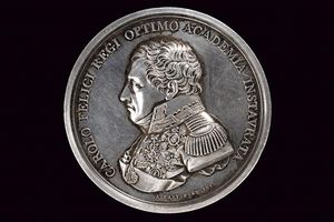 Regno di Sardegna, diametro 4.5 cm. 1823 In argento. Al dritto busto con uniforme e decorazioni, sguardo verso [..]