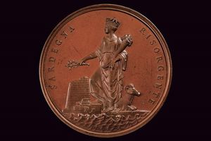 Regno di Sardegna, diametro 8.1 cm. 1831 In bronzo. Al dritto figura allegorica della Sardegna in piedi su molo [..]