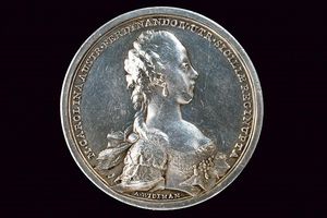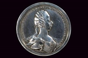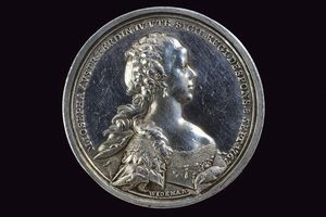 Vienna, diametro 4.2 cm. 1768 In argento. Al dritto busto della regina con sguardo rivolto verso destra, al bordo [..]
