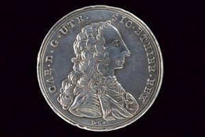 Napoli, diametro 4.14 cm. 1751 Sul recto busto a destra con iscrizione 'CAR.D.G.UTR.SIC.ET HIER.REX'. Opus De [..]