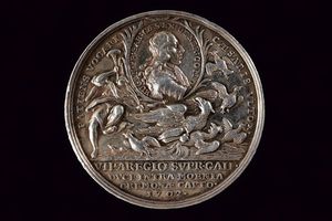 Ducato di Savoia, diametro 4 cm. 1702 In argento. Al dritto, entro ovale fregiato da rami di palma, busto a destra [..]