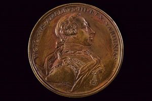 Regno di Sardegna, diametro 4.6 cm. 1775 In bronzo. Al dritto busto a destra con parrucca, armatura, mantello [..]
