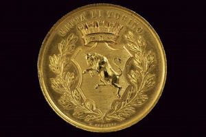 Regno di Sardegna, diametro 5.5 cm. 1846 In oro. Al dritto bella rappresentazione del profilo di Carlo Alberto [..]