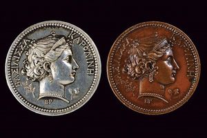 Regno di Napoli, diametro 2.2 cm. 1808 Una in bronzo e una in argento (6 g), aventi il dritto di ugual fattura. [..]