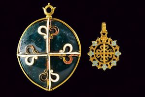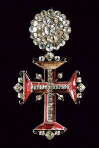 Portogallo, dimensioni 4.5 x 8.8 cm. fine del XVIII Sec. Pendente con croce in oro ed argento recante bellissime [..]