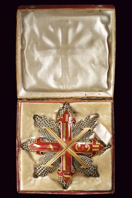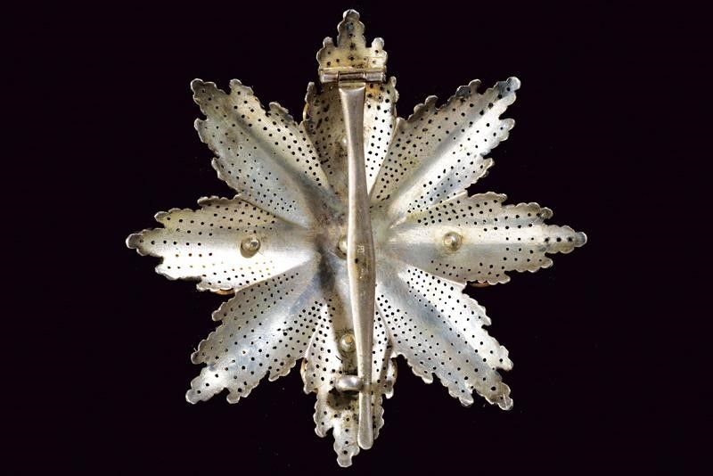 1820-30 Placca di Gran Croce in argento brillantato e traforato. Il centro in oro e con smalti rossi (piccoli chip). Sul retro spilla verticale con due punzoni. In astuccio contemporaneo marcato in oro sul fondo 'Jgnace Jos. Schmidt BIJOUJIER DE LA COUR Impériale