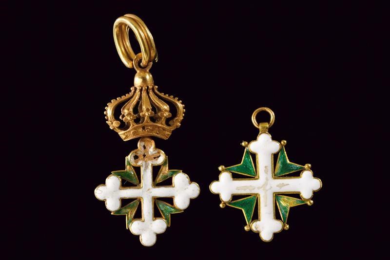 fine del XVIII Sec. Croce da ufficiale, in oro con smalti (vari chip), con corona traforata. Insieme con una croce da cavaliere in oro e smalti (chip).