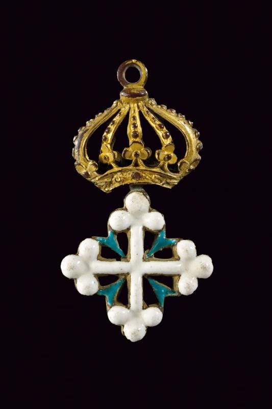 1770/80 Croce da ufficiale. Interessante e raro esemplare del primo quarto del XIX secolo in metallo dorato e smaltato con grande corona traforata (nella corona alcune mancanze dello smalto). Rara.